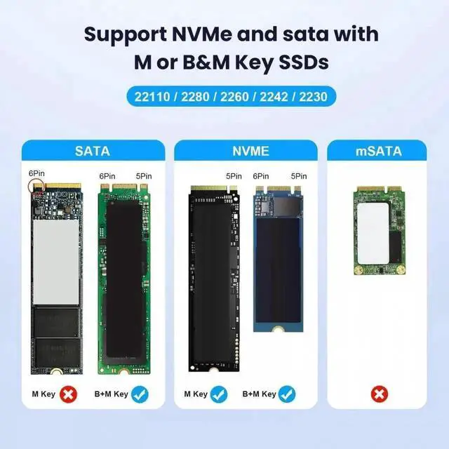 This USB3.0 to M.2 SSD Enclosure only for NVMe PCIE M-Key / B+M connectors M.2 SSD. Applicable to sizes 2242 / 2260 / 2280 solid state drivers.