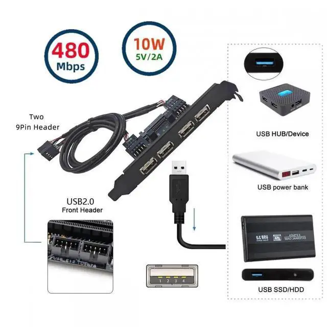 • With this cable, you can directly connector motherboard 9pin socket, converted to four usb2.0 socket. You can use USB 2.0 type-A female convert USB2.0 (9pin Header) directly connected to the motherboard.