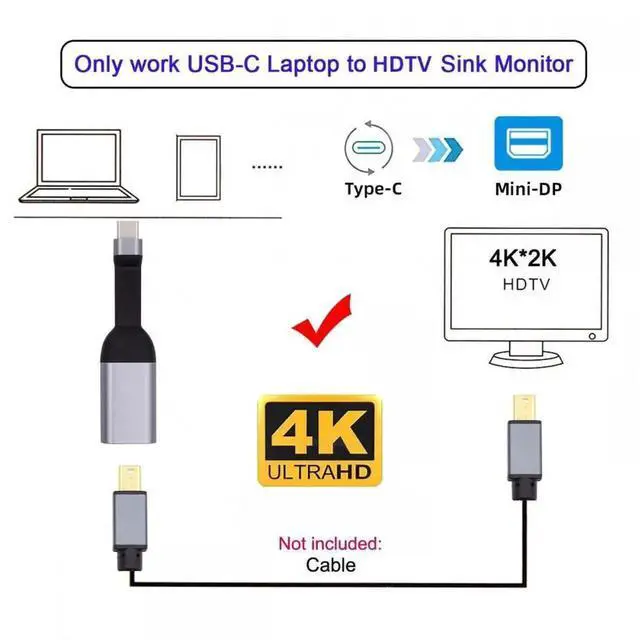 Compatible with Type-C USB-C source toMiniDisplayport4K sink displays output; Not Compatible withMiniDisplayportsource to Type-C USB-C sink output.