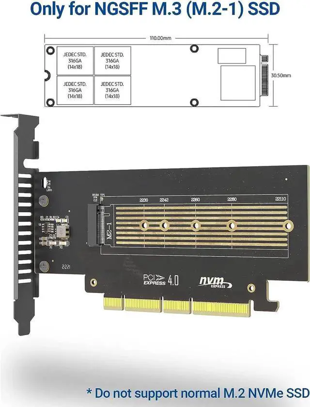 PCIe 4.0 x4 lane adapter card for M.3 NGSFF NF1 NVMe 110mm SSD which support works in the motherboard PCIe x4 bus slot