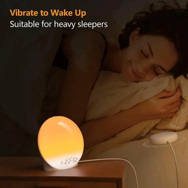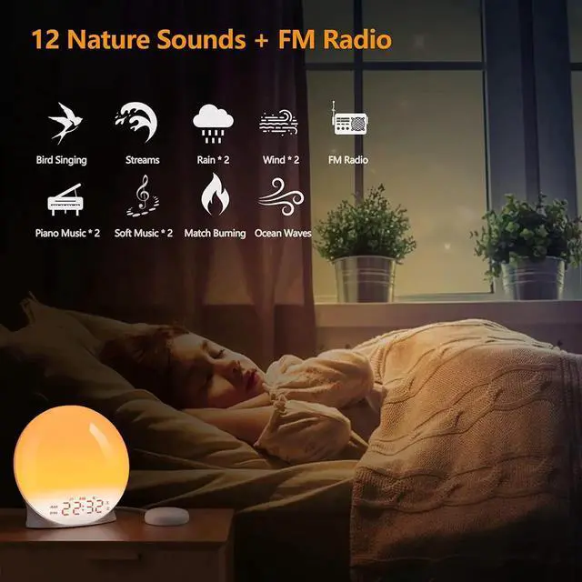 Sunrise alarm clock and wake up lightIt will light up 10-60 minutes before the preset wake up time, the color and brightness gradually change from red to bright yellow, and then the light intensity gradually increases from 10% to 100%, simulating the light and sound of natural dawn, to help you wake up naturally. There are 12 natural sounds and an FM radio to help you sleep.