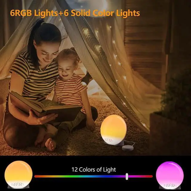 12 Color Lights and 20 Brightness AdjustableSunrise Alarm Wakeup Light has 12 light modes (6 solid colors and 6 RGB colors). One-touch buttons allow you to easily switch light modes and adjust brightness from level 0 to level 20. Increase the brightness of the light to make it a corner ambient light, providing basic lighting. Turn down the brightness of the light and make it a bedside lamp to help you fall asleep quickly.