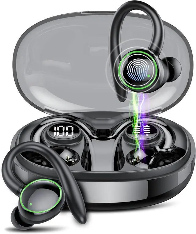 Wireless Earbuds, Bluetooth 5.4 Headphones Sport, Over Ear Buds With ENC Noise Cancelling Mic, 48H, Wireless Earphone With Earhooks, Stereo Deep Bass, IP7 Waterproof for Workout Running, Dark Black