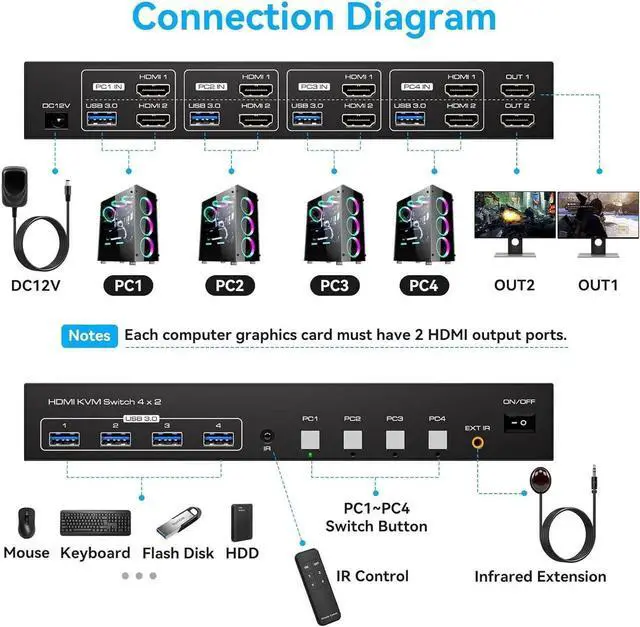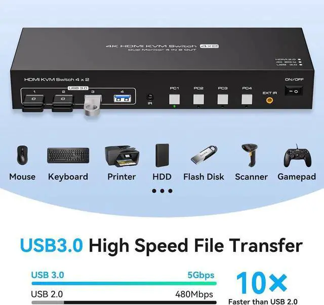 The kvm switch 4 port allows 4 computers to share one monitor and 4 USB 3.0 devices, enabling you to control 4 computers and one monitor directly with a single set of mouse and keyboard. With just the press of a button, you can seamlessly switch between the four computers. This plug-and-play solution simplifies your workspace and boosts office efficiency.(Please note that using this device requires that each of your computers and monitors contain at least 1 HDMI port.)
