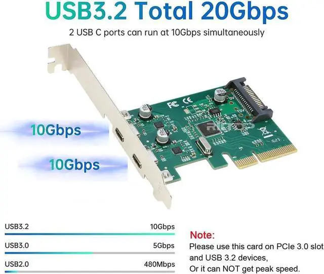 10Gbps USB 3.2 Gen2 The usb c pcie card can add 2 extra super speed USB C ports to your computer, each with a maximum transfer speed of 10Gbps, and both ports can run at high speed at the same time.
