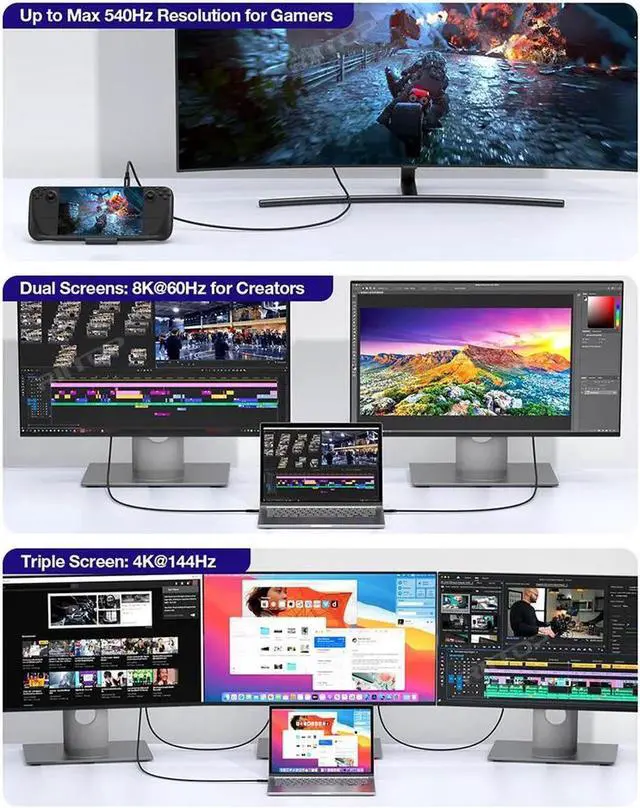 Dual 6K or 8K Display Support: Empower your visual experience by connecting dual 6K or dual 8K or triple 4K @144Hz displays.