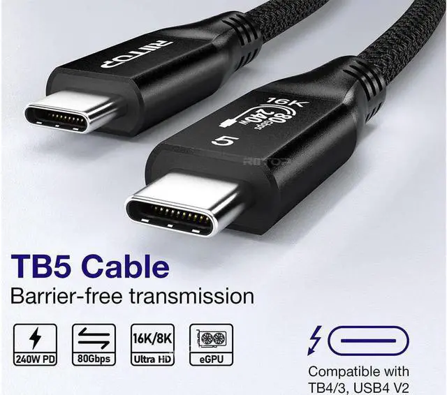Universal Compatibility: RIITOP Thunderbolt 5 cable seamlessly connects with a wide range of devices, including all Thunderbolt 3, Thunderbolt 4, USB4, and USB-C equipment. Data transfer rates up to 80 Gbps of bi-directional data transfer and up to 120 Gbps of video bandwidth.
