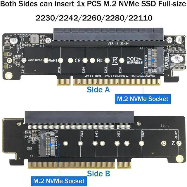 1. Two Slots of NVMe SSD are on positive and negative sides. So the card is in small size, And individual LED Indicator design will show each SSD's Working Status.