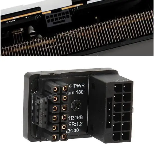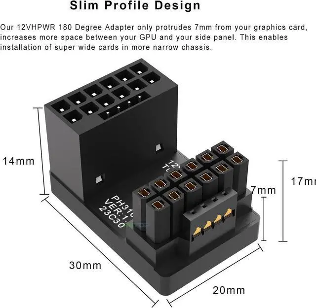 180 Degree 16Pin (12+4) Pin Adapter 180 Degree Angle allows to work with your original power cable, and have a suitable extension direction, which can avoid the wear of the cable and the input port of GPU, extend the service life. and our 12VHPWR 180 Degree Adapter only protrudes 7mm from your graphics card, increases more space between your GPU and your side panel. This enables installation of super wide cards in more narrow chassis.
