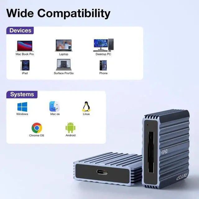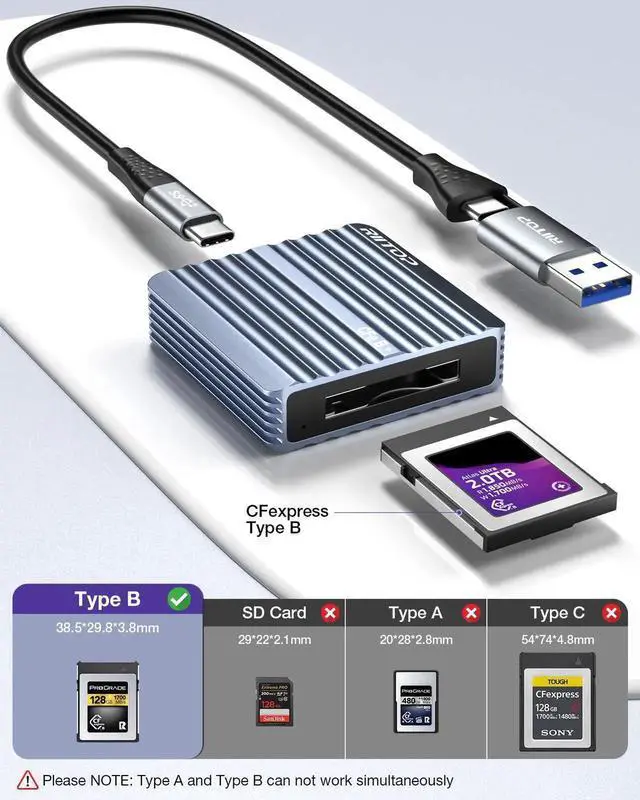 Compatible with most operating systems such as Windows XP/Vista/7/8/8.1/10, Mac OS etc. This CFexpress card reader compatible with CFexpress Type B memory cards. Note: Not compatible with CFexpress Type A/C and XQD cards.
