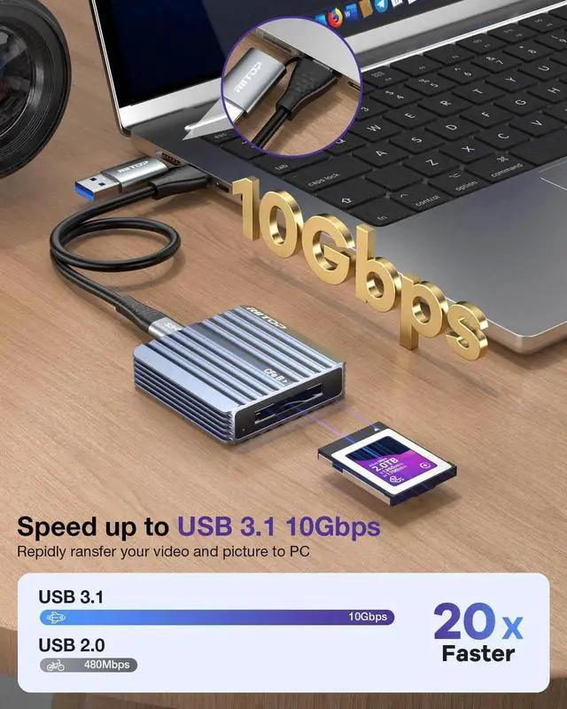 10Gbps CFEXPRESS Type B Card Reader - RIITOP CFexpress memory card (Type B) Card Reader supports USB3.2 Gen2 (10Gbps) super speed data transfer for your CFexpress card.In order to reach 10Gbps high speed,the USB/USB C port of your devices must reach the speed of USB 3.2 GEN2. Note:The final data speed is decided by the card and USB slot Type