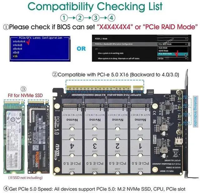 2. If the motherboard does not support PCIe x16 bifurcation, only one SSD will be recognized. If BIOS can only set X8X4X4 or X4X4X8 mode can only recognize 3 x NVMe SSDs.) Please verify bifurcation support in your motherboards manual or on the manufacturer's website before purchase.