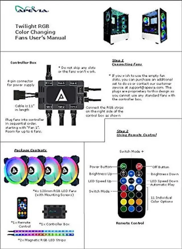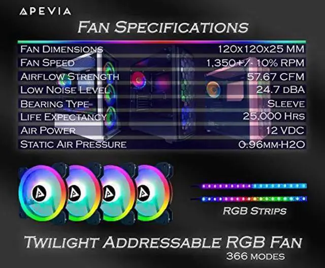 Add style to your system with Apevia's 120mm Twilight RGB color changing LED fans. With 366 selectable modes, you can find the look and style combination that's a fit for you. The remote control that comes with the controller allows you to set the color scheme that you're looking for. The control box itself has room for up to six specially designed compatible fans that contain enough LEDs to light up your life. Meanwhile, anti-vibration rubber pads keep the fan silent. Also comes with two synchronized magnetic color changing LED strips with 18 LED lights.