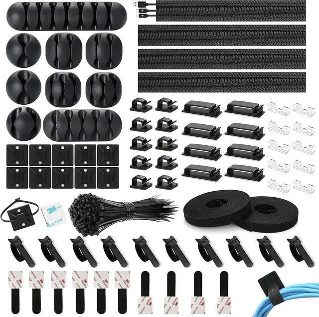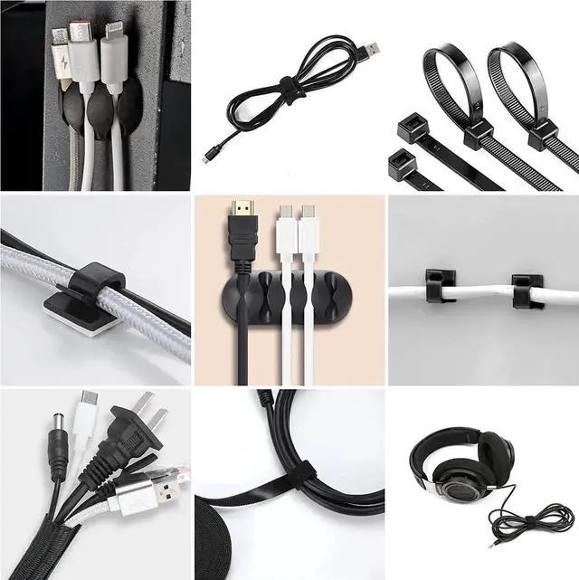 This comprehensive kit includes everything you could possibly need to organise and manage all your cables at the home or office including include 4 Cable Sleeve Split with 47 Self Adhesive Cable Clips Holder, 10 Cable Ties, 10 Adhesive Wall cable Tie, 100 Fasten Cable Ties, 2 x Roll Cable Ties