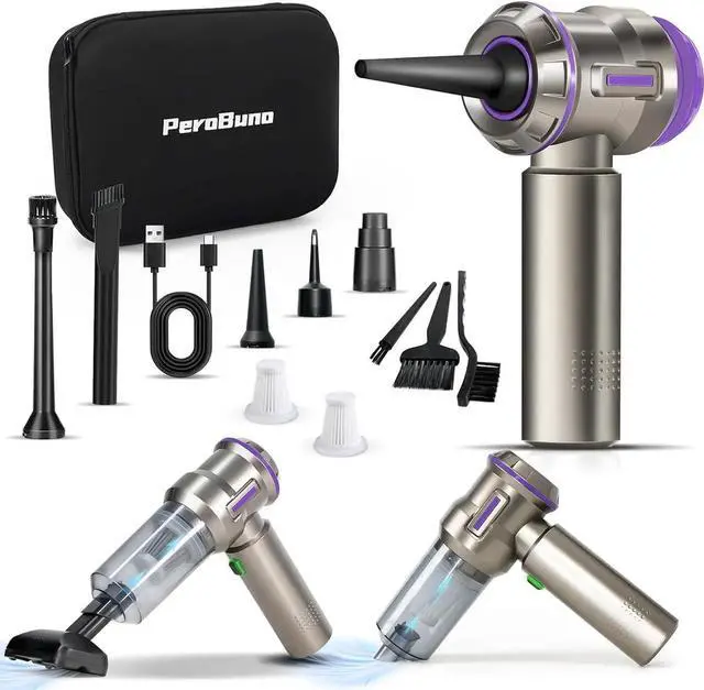 [ 2-in-1 Air Duster and Mini Vacuum ]: Say goodbye to dust and debris with this compact PeroBuno compressed air duster that doubles as a mini vacuum. Perfect for cleaning dust from any electronic equipment, computer keyboards and other surfaces in the car, home or office.