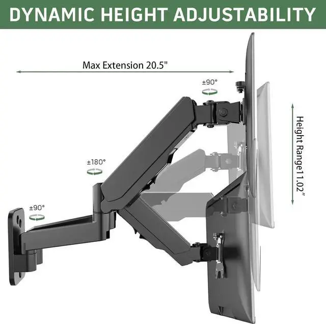 • Dual monitor arm assists height adjustment up to 11.02", easily to find an optimal angle for your work as you need. Adjusting the monitor adapts to your posture by arm extension, vertical tilt ±35° , horizontal swivel ±90°, and landscape or portrait rotation ±180°.