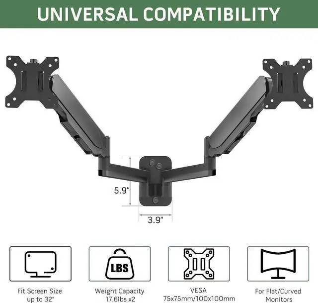 • The dual monitor wall mount perfectly fits most of LCD LED flat screens and computer monitors up to 32 inches and 17.6 lbs, compatible with VESA patterns of 75x75mm and 100x100mm.