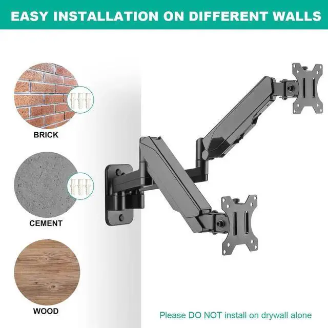 • With monitor wall mount, the perfect angle is maintained between your monitor and your eyes, preventing neck strain by aligning your spine at the right position. Heavy duty monitor arm with built-in cable control professional helping to hide wires. The arm free up desk space while creating a more comfortable work environment.