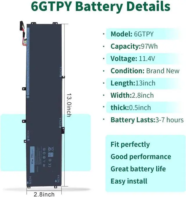 Quality and Certification:Our 6GTPY Battery 97Wh is highly compatible with the original Dell XPS 15 9560 battery and meets CE/FCC/ROHS/UL certified standards. It is a brand-new product from the manufacturer and supports up to 1000 recharge cycles.