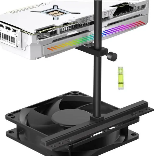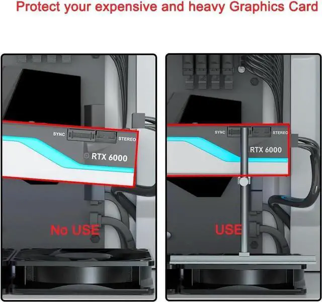 Aluminum Graphics Cards Support for Fan Mounting: The Graphics Card support bracket is installed on the fan and fixed with screws. It does not block the fan air outlet and firmly supports the graphics card. a good choice if you have fans in the bottom of case