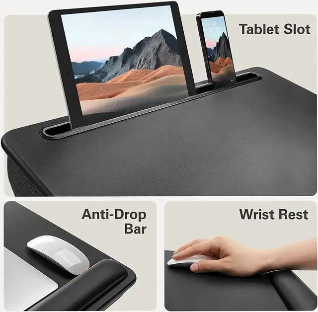 Multifunctional Design: The laptop computer lap desk features a tablet and phone slot to store your display devices while you work. A support ledge runs along the front edge of the platform for wrist support and to keep your laptop from falling.