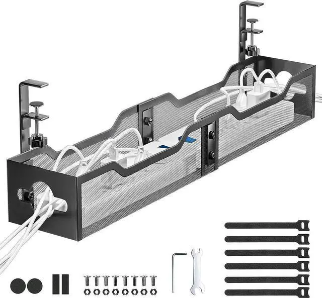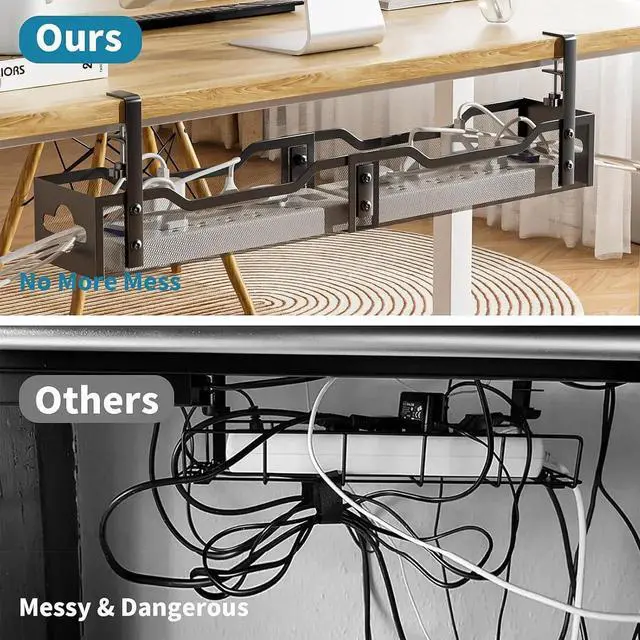 Save Storage SpaceNo more messy, tangled cords on your desk or floor, no more worry about kids tripping over or cords being sucked up by the vacuum cleaner. Our desk wire management can hide your data cables, power cords and outlet strips from your feet to keep your desk and floor clean and tidy.