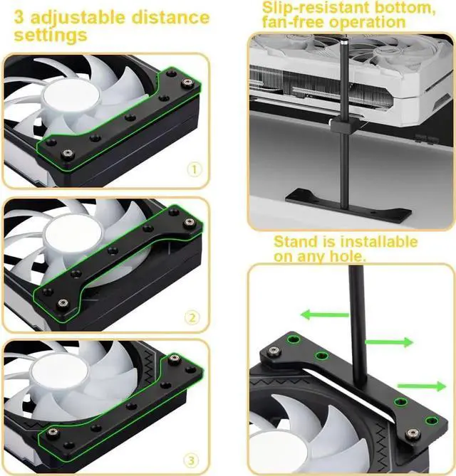 Wide Compatibility GPU Support: the GPU Support adjustable height is from 0.63 to 6.3inch , it can be detachable to 2 parts (3.1 inch+3.1 inch height), you can install it on bottom fan or top fan according to your layout. Comes with different screws, fits for most fan (12mm) and cases (ITX MATX ATX). Please make sure the height works on your device before purchasing.