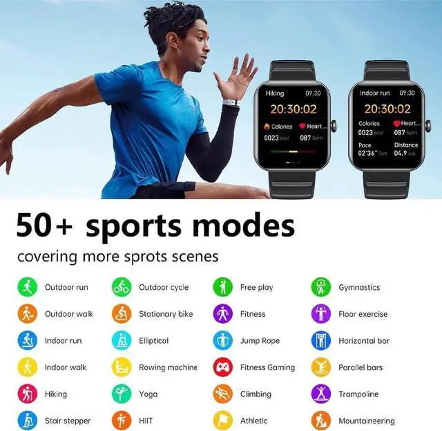 50+ Sports Modes & Fitness TrackerFitness watch comes with 50+ sports modes such as soccer, walking, running, aerobics, hiking, cycling, mountaineering, yoga, HIIT, fitness etc. This smart watch for men women can monitor your body temperature, heart rate, blood pressure and blood oxygen levels, energy metabolic, accurately record all-day activities like steps, distance, calories burned, miles walked, and active minutes.