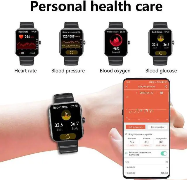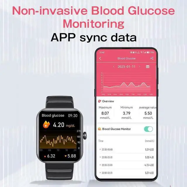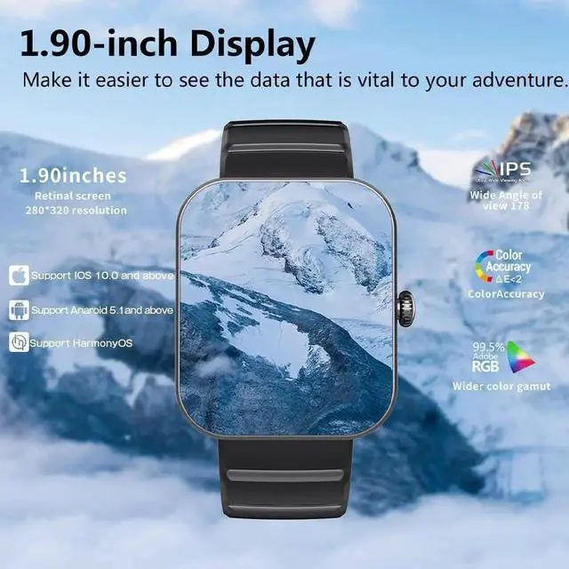 Painless Continuous Glucose Monitoring This smart watch built-in blood sugar detection high-performance chip, combined with intelligent algorithm, can make you always know your blood sugar value. The Blood Glucose test data will be affected by the difference of the environment and only serve as a warning. Smartwatch features a 1.90 " color touch screen, easy to view various data and information, providing you with a high-quality visual experience.
