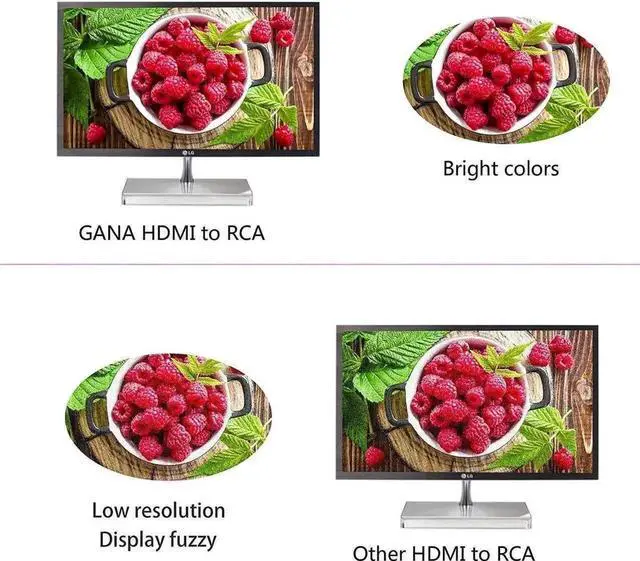 The HDMI to RCA/AV Converter converts HDMI video/audio signal to AV(CVBS) composite video signal and the FL/FR stereo audio signals, support DVI system sideline signal