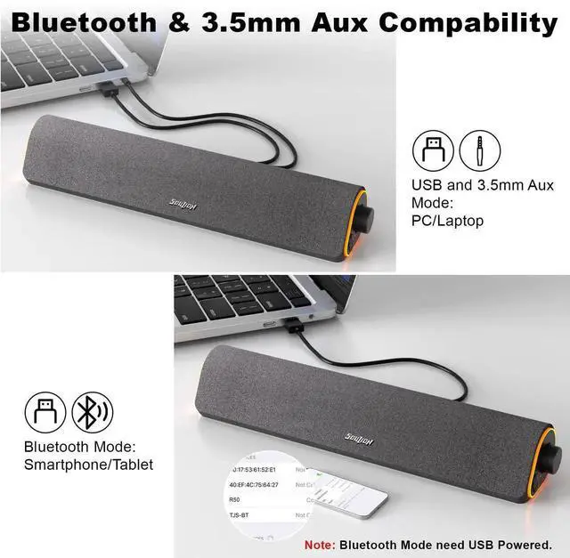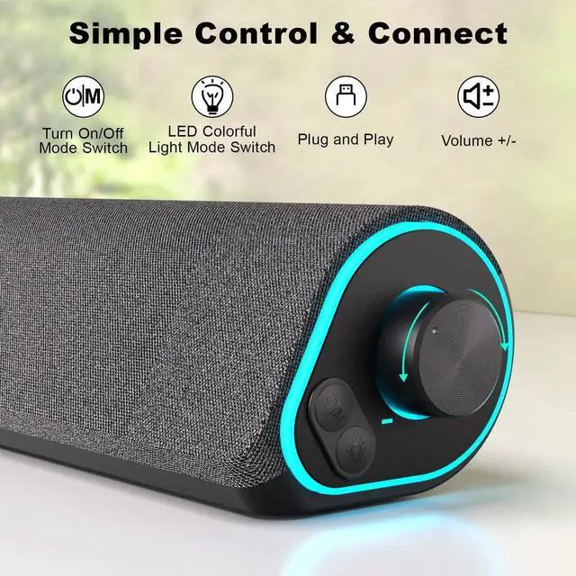 R50 Bluetooth Computer Speakers, 3.5mm PC Sound Bar for Desktop Monitor, Wired USB Powered & Colorful LED Lights with Switch Button, Surround Sound Soundbar PC Spearkers for Computer