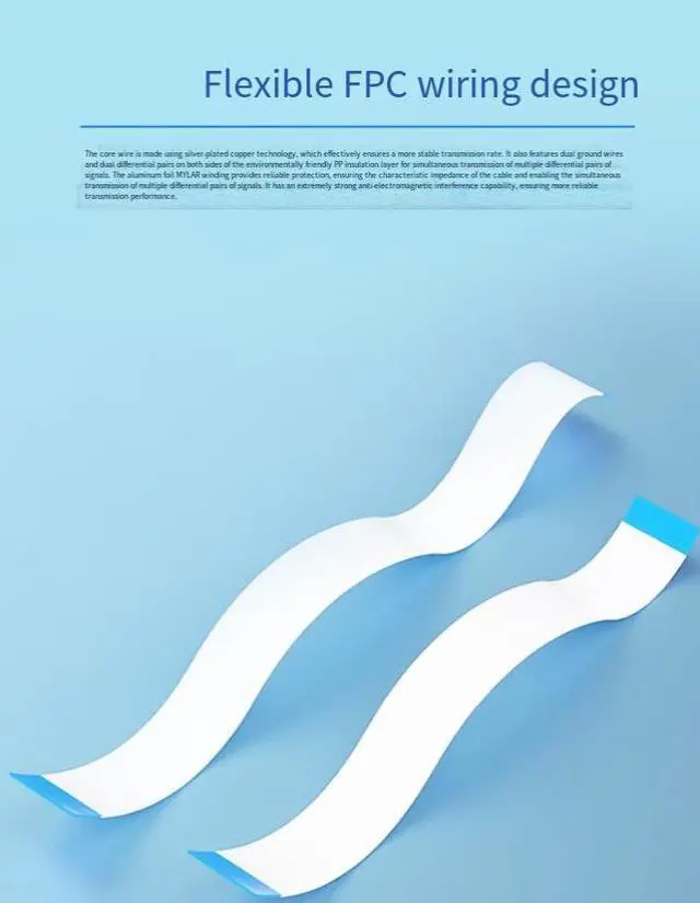 The core wire is made using siver- plated copper technology, which effectively ensures a more stable transmision rate Itis equipped with anenvironmentaly friendly PP insulation layer, and there are dual ground wires and dual differential pairs on both sides for simultaneoustransmission. The aluminum foil MYLAR winding ensures rela ble ca ble characteristic impedance,enabing the simultaneous transmission otmultiple differential pais of signats. t has an etremely strong anti-electroma gnetic interference ability.ensuring more relable transmissionperformance