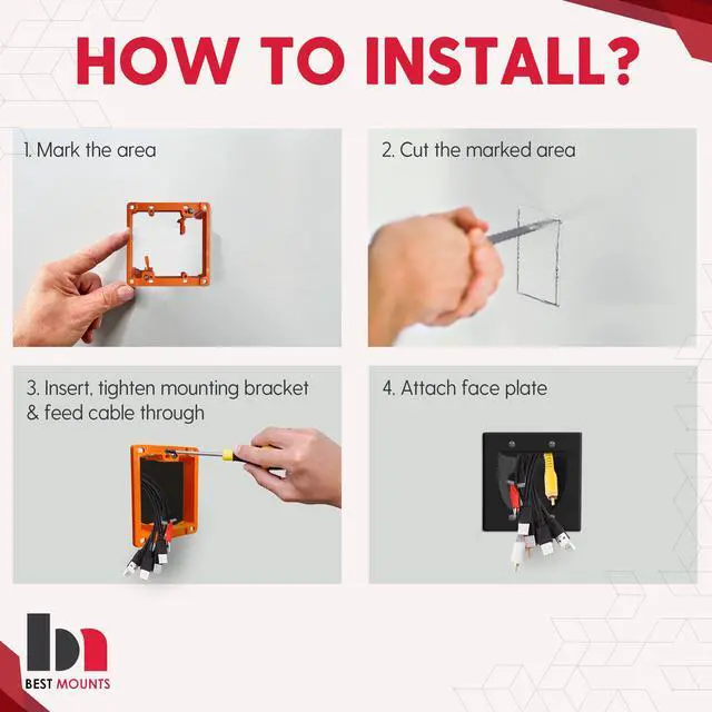 - - This cable outlet cover plate is very easy to install with the built-in wall template in the mounting bracket that shows you exactly where to cut. Just bring a drywall saw and screwdriver and you're ready to hide those ugly dangling cables.