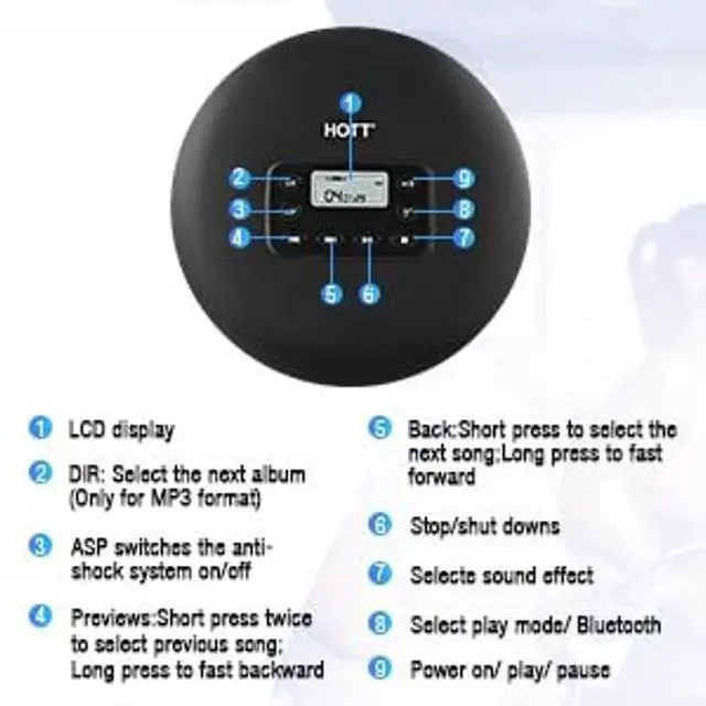 ^^ Anti-Shock Protection: HOTT potable CD player with Bluetooth is designed with Anti-shock Protection, which provides a stable audio experience when moving with up to 45 seconds anti-skip protection for CD and 120 seconds anti-skip protection for MP3.
