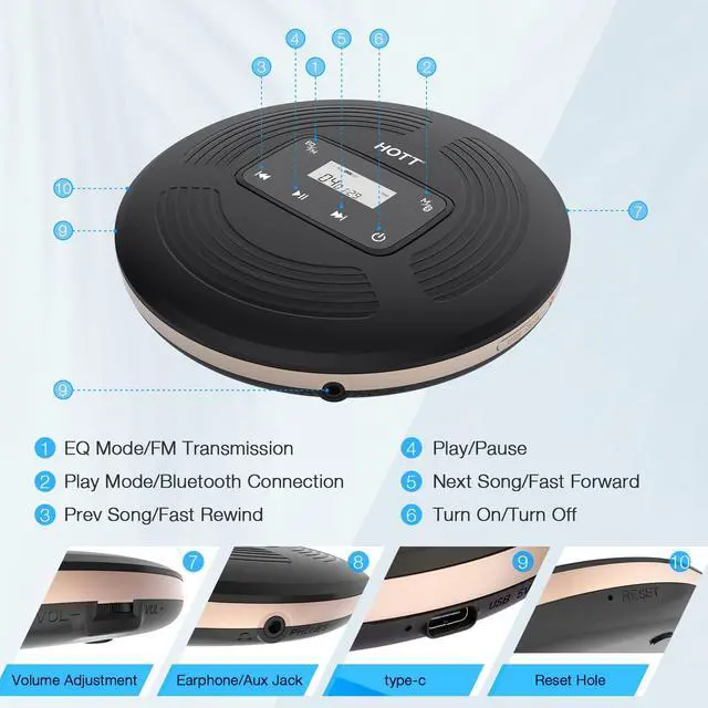 (NOTE: only works with a 3.5 mm AUX port, USB port is NOT supportable) ^^ ASP and Last MemoryThe Small Cd player has anti-skip protection, so that the CD player will not interrupt the playback even in the state of shaking and bumping. It supports fast forward, fast rewind, select segment repeat play. The last memory function can remember the song you heard last time, and it will play from the track where you stopped. ^^ Rechargeable CD PlayerBuilt-in 1800mAh lithium battery, the HOTT personal CD player can play CDs for more than 10 hours after 3-4 hours of full charge. Using included USB cable for charging, Type-C port, portable and convenient. It's prefect for home and traveling. Touch technology and backlight design make the disc player different. ^^ Great GiftExquisite gift box packaging, this CD Player is a perfect gifts for kids, elders, parents, friends and pregnant women etc. The CD player supports five playback modes, suitable for language learning, prenatal education / antenatal training, early education, CD music player and home or coffee house decoration.