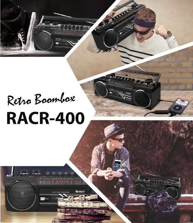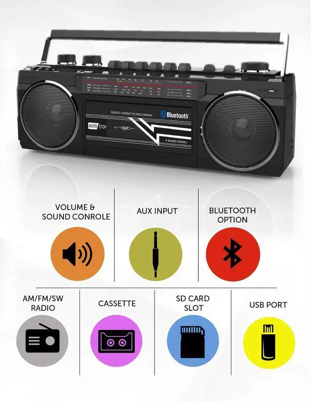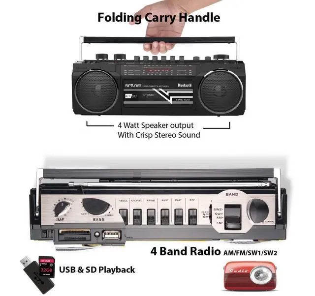 CASSETTE PLAYER/ Recorder with WIRELESS BLUETOOTH CONNECTIVITY; This wireless Boombox features Bluetooth for wireless music streaming w/a connectivity range of up to 30 ft. Works w/ any device that features Bluetooth connection 4 Band Portable Radio; Features AM/FM Radio and Shortwave Radio SW1-SW2 ^^ USB, SD - Aside from wireless connectivity, this Retro unit is also equipped to connect to your other Music Files USB & SD Playback; play your music files on this Boombox via the USB and SD slots ^^ Volume and Bass Controls - for better sound effect - FOLDING CARRY HANDLE; Built-in carrying handle- Portable design makes this Cassette Player perfect for the on-the-go user - Aux in -Telescopic Antenna ^^ AC 110v Power (cable included), or 4 x D size Batteries (Batteries sold separately) ^^ Available in a verity of colors of your choice - Yellow, Red and Silver