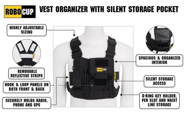 Silent & Secure Buckle Closure Features dual adjustable nylon buckles for a noise-free, hassle-free design, offering a more reliable and quiet alternative to hook & loop fasteners. ^^ Spacious & Organized Storage Large interior pocket with elastic slots secures your tools, gear, and valuables, keeping everything neatly organized and within reach. ^^ Pro-Grade Durability Built for professionals, this vest is made with 600D PVC-coated ballistic nylon, featuring ruggedized construction and reinforced stitching for extreme durability. ^^ Customizable & High-Visibility Hook & loop panels on the front and back let you add custom patches, while reflective safety stripes enhance visibility in low-light conditions.