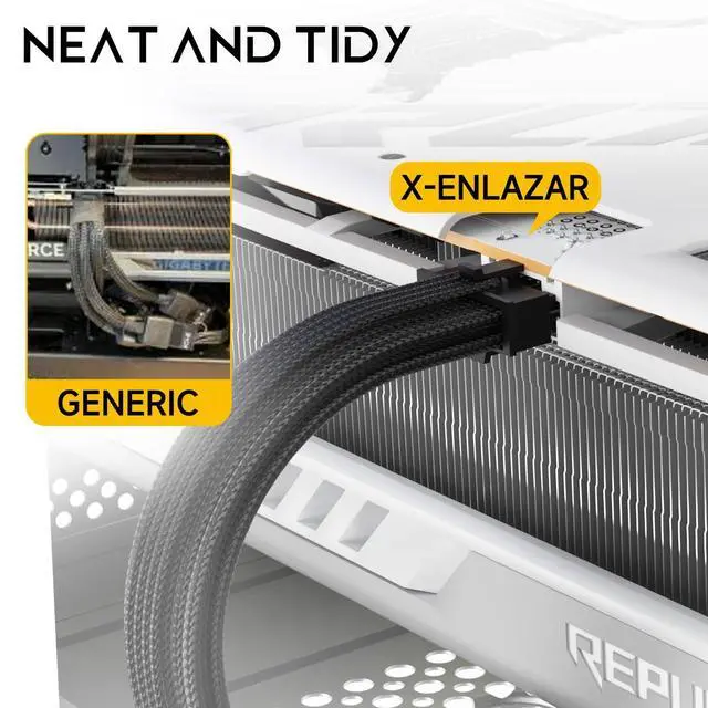 STANDARD CONNECTORS, 12VHPWR CABLE - The X-Enlazar 12V-2x6 cable features premium quality wiring, connectors, and sleeving for ultimate peace of mind; Compatible with NVIDIA RTX 40-/50-Series GPUs & ATX 3.0 / 3.1 PSUs; RoHS 2.0 compliant ^^ INDIVIDUALLY SLEEVED - Each wire is individually sleeved for a cleaner look at the connectors and is sheathed in fire-retardant PET-yarn braided sleaving (UL1977); Cable includes four transparent combs for a smart finish (not pre-installed) ^^ SUPERIOR 16AWG WIRING - X-Enlazar uses 16AWG oxygen-free pure copper wires (UL758) with SRPVC insulation (UL1977); Each wire is crimped to copper-alloy terminals (C18400) for superior conductivity (83%) through secure precision-casted connectors ^^ PRECISION CAST CONNECTORS - X-Enlazar precision-cast connectors are carefully designed to be easier to plug/unplug without compromising a secure fit ^^ 600MM CABLE - A generous 600mm end-to-end cable length provides excellent support for mid- and full-tower cases with a PSU shroud; Maximum supported direct power from PSU to