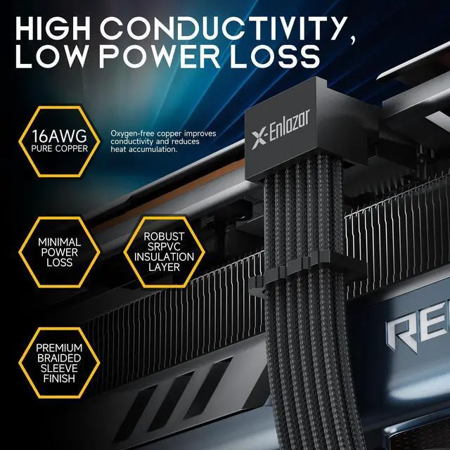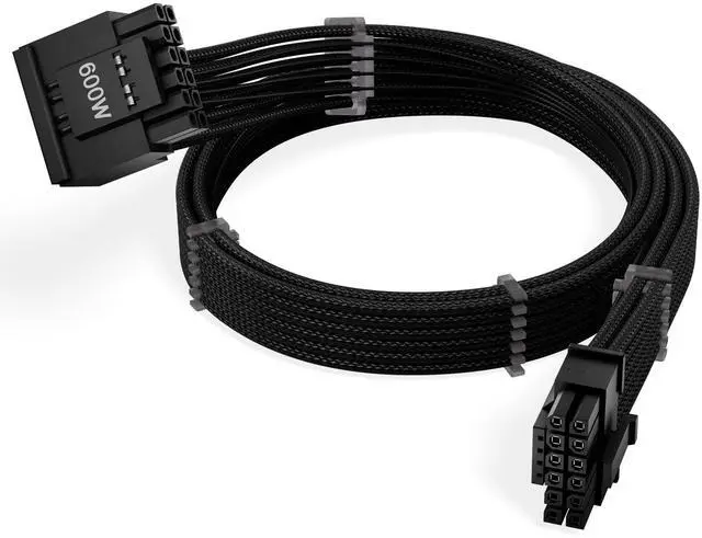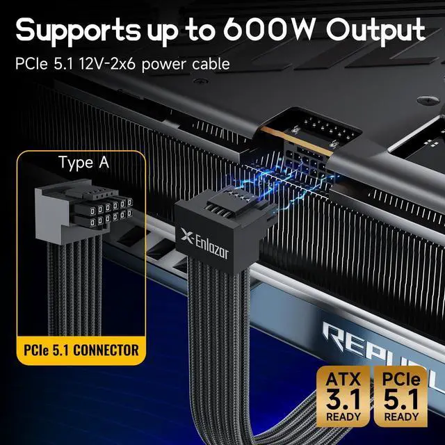 The X-Enlazar 12V-2x6 PCIe 5.1 GPU cable offers premium PC aesthetics, superior connectivity reliability, and saves space for improved airflow. Compatible with NVIDIA RTX 40-/50-Series GPUs & modular ATX 3.0 / 3.1 PSUs. This cable type supports 12V-2x6 H++ NVIDIA 40- and 50-Series graphics cards (up to 600W) and employs an X-Enlazar patented 90-degree (L-angle) connector, which helps simplify cable management, improves connection fidelity, and saves space when dealing with tight bends. Cable 9SIBM9BJWU7143 employs a type-a (standard type) connector for graphics cards with the lock/fastener located below the connector when installed, and features black PET braiding.