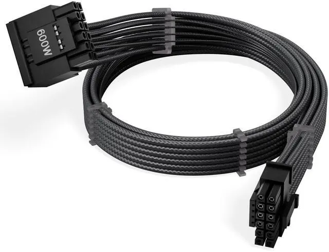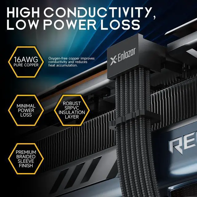 The X-Enlazar 12V-2x6 PCIe 5.1 GPU cable offers premium PC aesthetics, superior connectivity reliability, and saves space for improved airflow. Compatible with NVIDIA RTX 40-/50-Series GPUs & modular ATX 3.0 / 3.1 PSUs. This cable type supports 12V-2x6 H++ NVIDIA 40- and 50-Series graphics cards (up to 600W) and employs an X-Enlazar patented 90-degree (L-angle) connector, which helps simplify cable management, improves connection fidelity, and saves space when dealing with tight bends. Cable 9SIBM9BK2G5157 employs a type-a (standard type) connector for graphics cards with the lock/fastener located below the connector when installed, and features gray PET braiding.