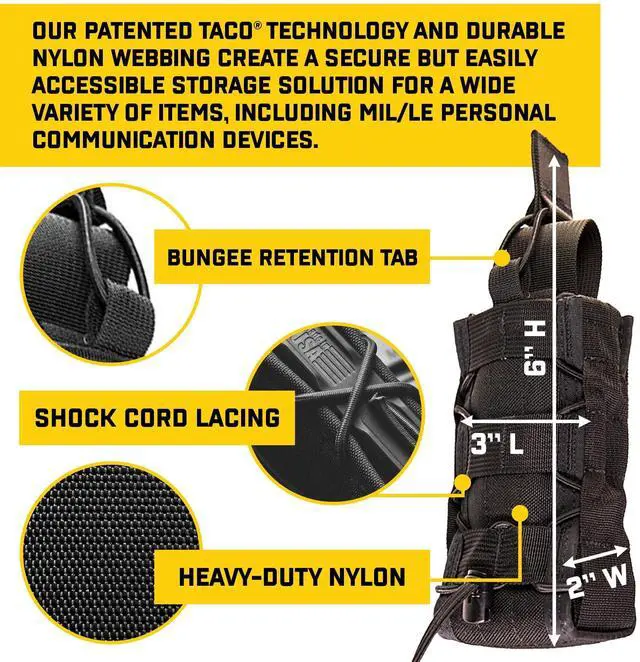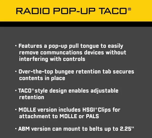 CONVENIENT WITH ADJUSTABLE RETENTION: The Radio Pop-Up TACO features a pop-up pull tongue for effortless removal of communications devices without interfering with controls, and an over-the-top shock cord retention tab to secure your radio.