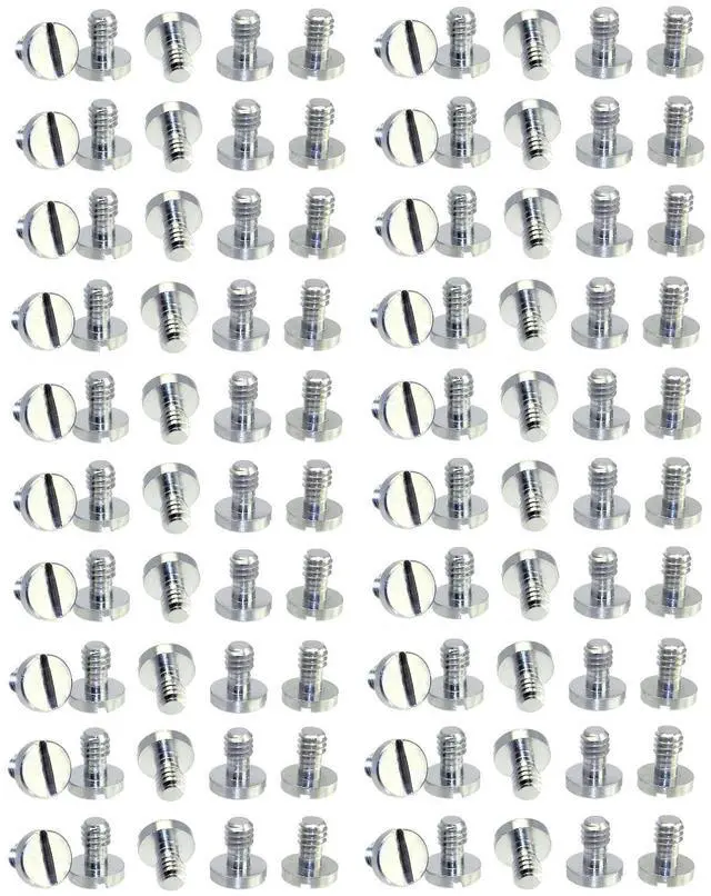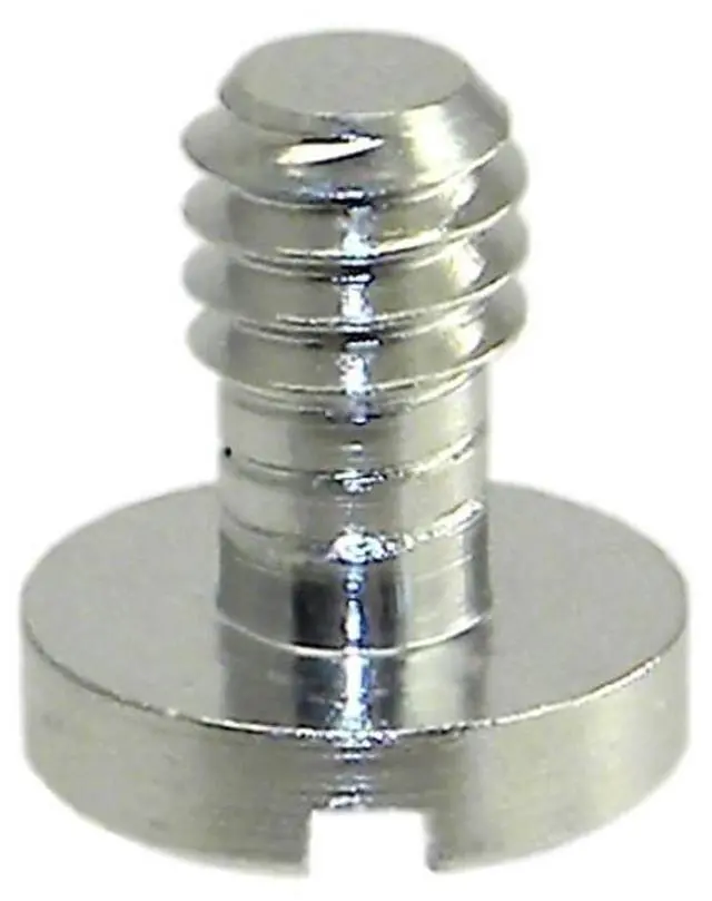 100 X 1/4" Stainless steel (metal) Tripod screws. 1/4" metal male thread with flat head screwdriver slot. Shaft is 10mm in length, approx 5.1 mm threaded, 5mm unthreaded Total length including base is 13.1 mm. Head Diameter is 12mm.