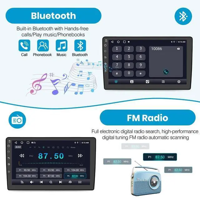 ^^ BluetoothFast match with phone, you can answer or make calls by the radio. coming with an enternal microphone, which will pick your voice clear and your car speskers let you hear the person on the other side precise. ^^ FM/AMThis product features FM/AM radio functionality with a digital display for precise and easy tuning. It provides clear access to news, music, and live weather broadcasts, making it a practical choice for daily use and emergency preparedness. ^^ Steering Wheel ControlA simple press of the steering wheel buttons allows you to toggle between radio stations and adjust volume levels, significantly enhancing both driving safety and operational convenience.