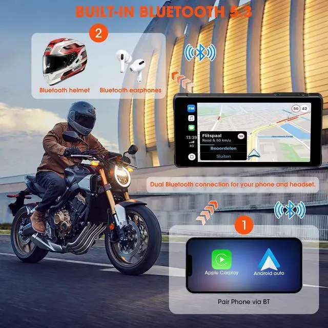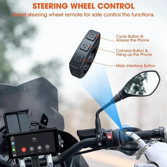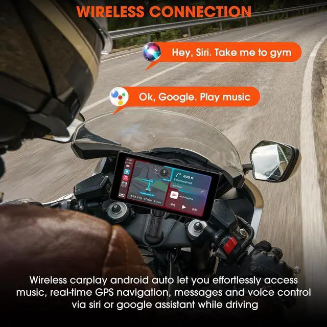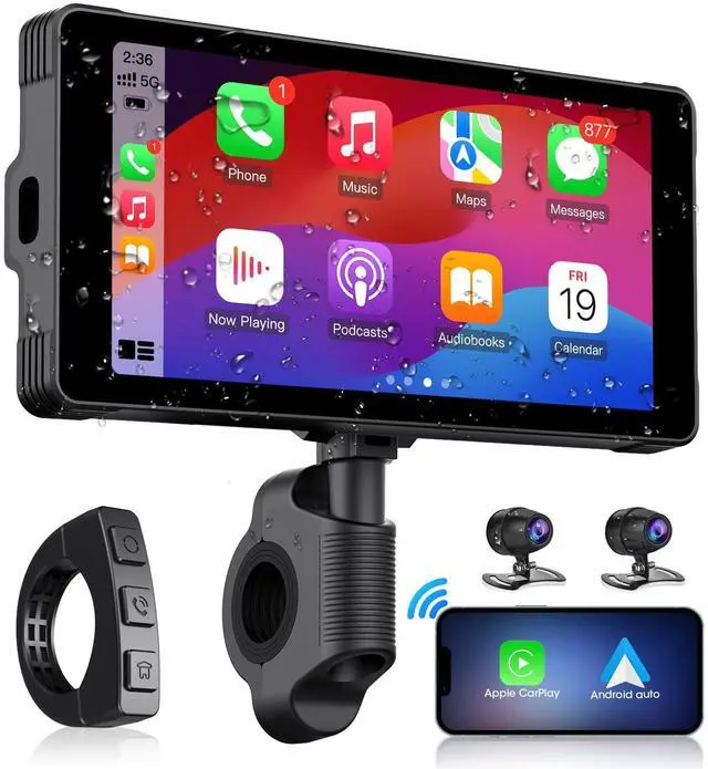 Portable Wireless CarPlay Dashcam for Motorcycle - Waterproof 5.5 Inch Android Auto Touchscreen with Front 1080P HD Car DVR and Rear Cam Bluetooth Voice Control GPS Navigation