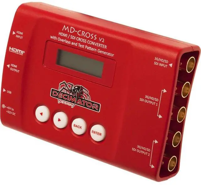 HDMI/SDI Cross Converter for 3G/HD/SD with Scaling, Frame Rate Conversion, Overlays and TPG. The MD-CROSS from Decimator Design is a feature-packed HDMI/SDI down up cross converter including a professional Test Pattern Generator. The MD-CROSS is controlled either via USB on a Mac/Windows app, or on-unit using the LCD screen and button controls. The unit comes with a Locking DC Power Supply, HDMI Cable and Mounting Bracket. Warranty for all Decimator Design products is 3 years.