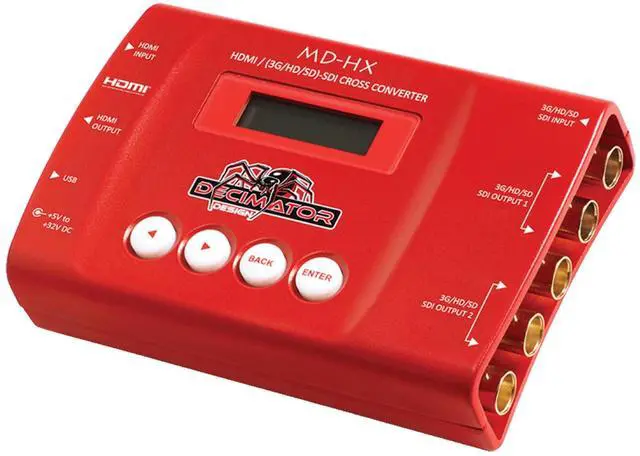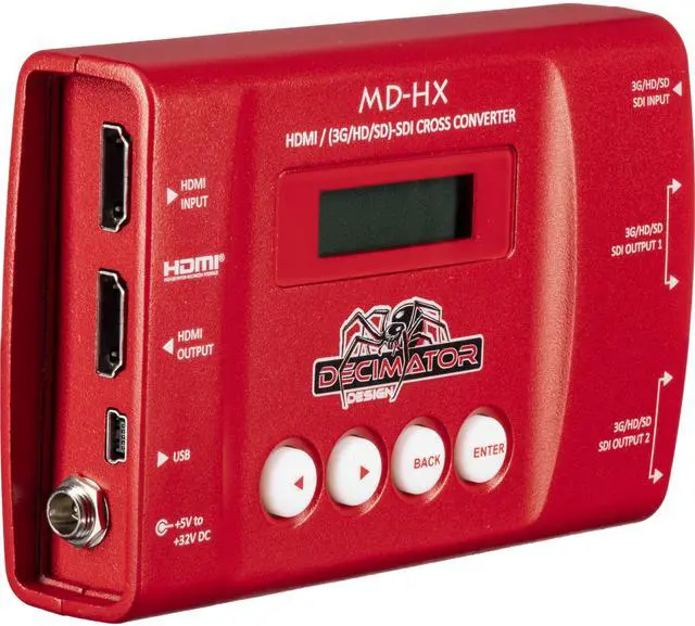 The Decimator MD-HX is a truly portable converter, which incorporates an easy-to-use LCD and button control system. This gives you easy access to all of the amazing features that have been unavailable without a computer until now. The days of having to play with complicated dip switches or having to carry around a computer to change a simple setting are gone. Cross ConverterThe Decimator MD-HX HDMI and SDI Cross Converter supports both 3G level A and B on the input and output, allowing conversions between A and B. It offers four (3G/HD/SD)-SDI outputs, that allow it to be used as a 1 to 4 distribution amplifier.