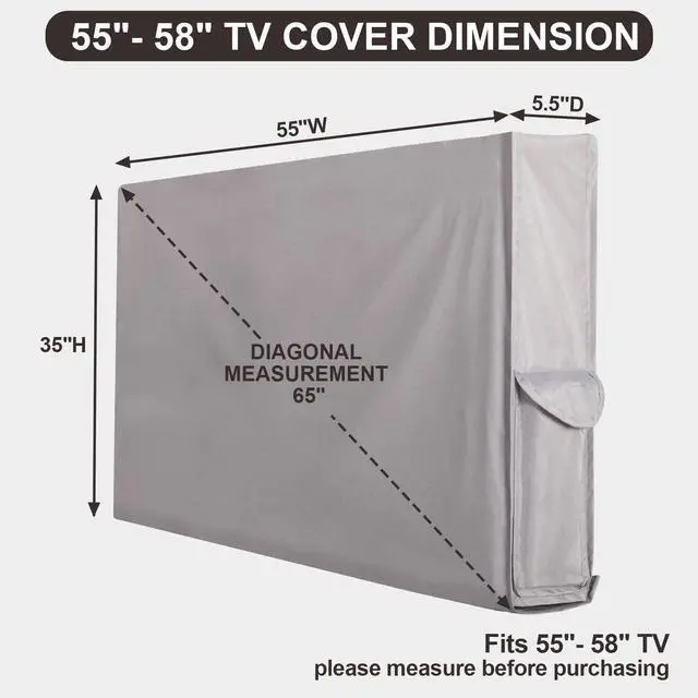 • SIZE DIMENSION: This outdoor TV cover measures 55"W x 35"H x 5.5"D, compatible with most television models and displays between 55 inch to 58 inch. Please measure your TV and choose a proper size to ensure compatibility.