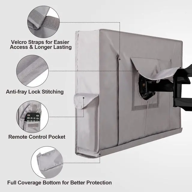 ^^ INNOVATIVE DESIGN: Our outside TV covers are designed with heavy-duty velcro straps with fabric overlap to ensure more comprehensive protection, ease of use, and a more secure fit than zippers. The sealed bottom provides 100% coverage and 360 degrees protection of the entire TV. Also, we have added remote control pocket on the side for easy access.