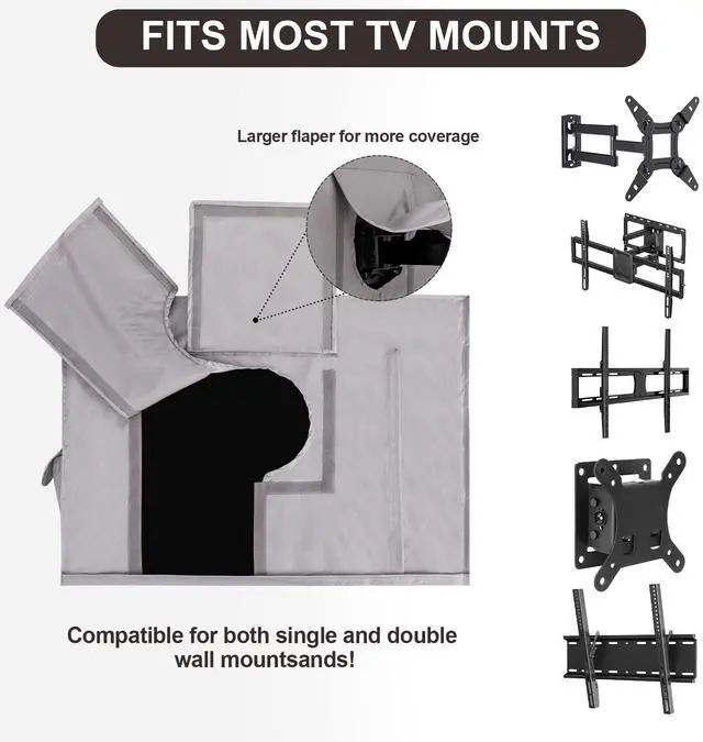 ^^ FITS VARIOUS MOUNTS: The outdoor TV protector's back features a large rounded opening that can be adapted to many types of mounts, such as double wall, single wall, ceiling mounts, tilting TV mount. And velcro with use, super easy to install, can be put on and off by one person in seconds! ^^