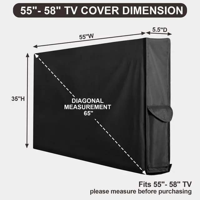 SIZE DIMENSION: This outdoor TV cover measures 55"W x 35"H x 5.5"D, compatible with most television models and displays between 55 inch to 58 inch. Please measure your TV and choose a proper size to ensure compatibility.